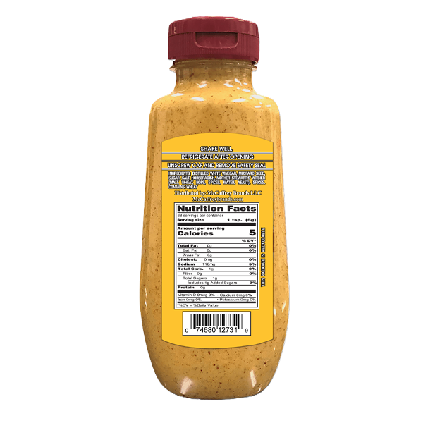 Ingredients: Distilled Vinegar, Sriracha Chili Pepper Sauce (Red Chili Peppers, Red Jalepeno Peppers, Distilled Vinegar, Sugar, Garlic, Salt, Xanthan Gum, Paprika Extract), Mustard Seed, Sugar, Salt, Spice, Xanthan Gum.*